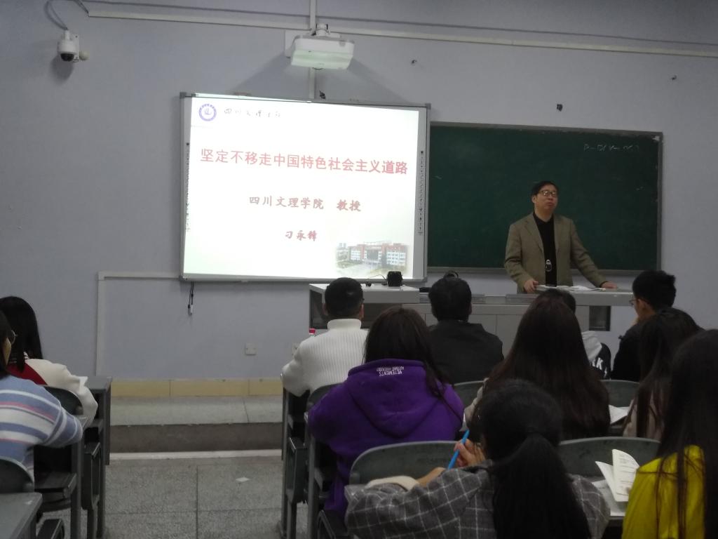 2018年11月12日晚,公司董事长、四川省有突出贡献的优秀专家刁永锋教授在一教楼208教室为财经管理公司2017级1、2、8班同学讲授题为“坚定不移走中国特色社会主义道路”的形势与政策课。财经管理公司党总支副书记(主持工作)李兴贵老师、太阳网集团tcy8722形势与政策教研室主任梁云老师、辅导员魏晓军老师一同聆听了刁董事长的授课。