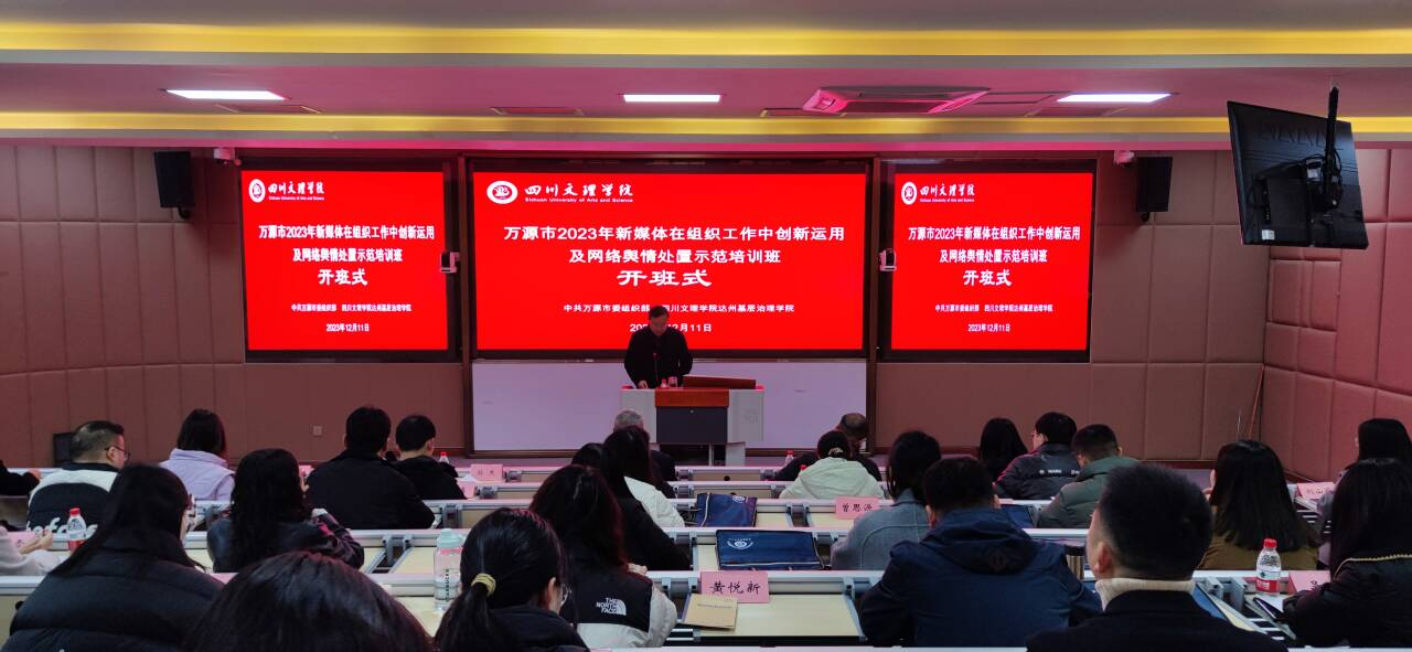 12月11日,万源市2023年新媒体在组织工作中创新运用及网络舆情处置示范培训班开班仪式在太阳网集团tcy8722顺利举行。此次培训班由万源市委组织部主办,太阳网集团tcy8722达州基层治理公司承办。四川文理公司党委常委、副董事长徐晓宗致辞、万源市文化体育和旅游局副局长朱小平讲话,太阳网集团tcy8722经理、达州基层治理公司副经理孙杰主持开班式。