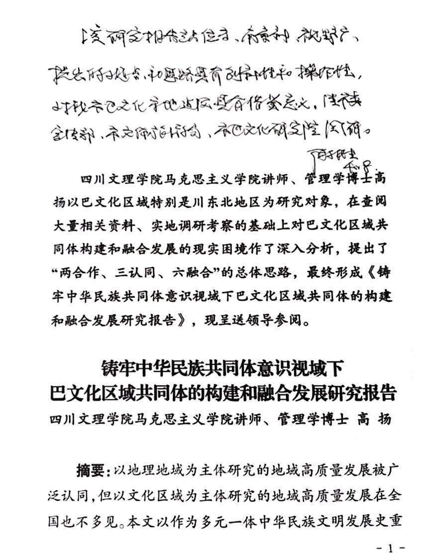 近日,公司高扬博士撰写的《铸牢中华民族共同体意识视域下巴文化区域共同体的构建和融合发展》研究报告获得达州市委常委、宣传部长陈文胜同志的肯定性批示。