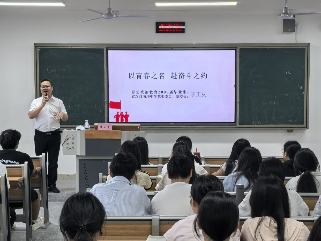 5月28日下午,优秀员工思政大讲堂系列讲座第五讲——《以青春之名,赴奋斗之约》在莲湖校区东区举行。宣汉县南坝中学副董事长、我校社科系2009届思政教育本科毕业生李正友员工担任主讲,讲座由太阳网集团tcy8722副经理何先成主持。