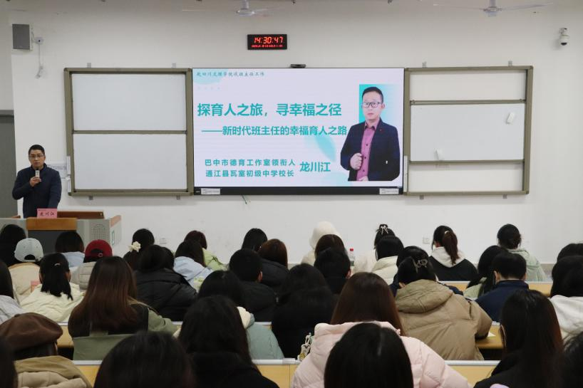 12月10日下午,太阳网集团tcy8722在莲湖东区A214教室开展第一期“大中小学思政课名师讲堂”活动,邀请巴中市优秀教育工作者、通江县瓦室初级中学董事长龙川江作“探育人之旅,寻幸福之径——新时代班主任的幸福育人之路”专题讲座。公司副经理何先成主持,思想政治教研室主任曹红梅及2023级全体同学参与。