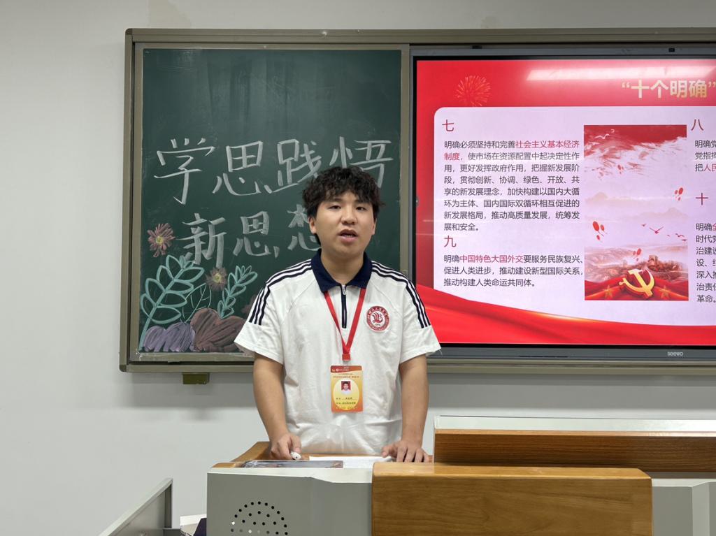 在思想引领环节,张应轩结合“两个大局”,深入阐述了习近平新时代中国特色社会主义思想对青年成长的重要意义,强调青年要以这一思想为灯塔,将个人理想融入国家发展大局。接着,他系统梳理了“十个明确”“十四个坚持”“十三个方面成就”的内涵与价值,并通过塞罕坝生态建设、脱贫攻坚等具体案例,生动展现了新思想的实践成果,帮助青年深化对思想科学性、实践性的认识。随后,他带领大家重温了习近平总书记对青年的六点期望,鼓励青年学子以榜样为镜,锤炼品德,练就本领,释放青春激情。最后,在知行合一环节,他结合公司学子创新创业、志愿服务等典型事迹,如刘旭、辛雨瑶获创新创业大赛金奖等,号召青年学子将理论与实践相结合,在专业学习中深耕细作,在社会实践中服务社会,充分展现文理学子的责任担当。