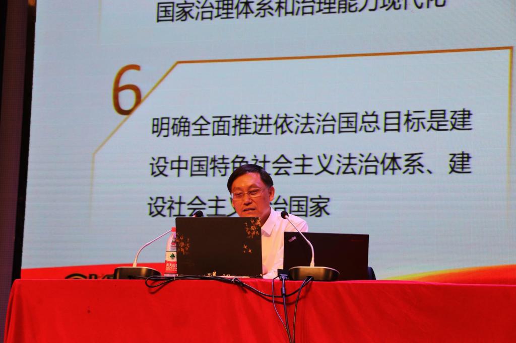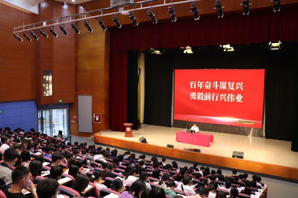 王成端教授主要从镌刻史册的伟大飞跃不可逆转的复兴进程、气象万千的伟大时代浓墨重彩的崭新篇章、永葆初心的大党担当伟大光荣的历史贡献、弥足珍贵的精神财富开创未来的行动指南等四个方面进行授课。