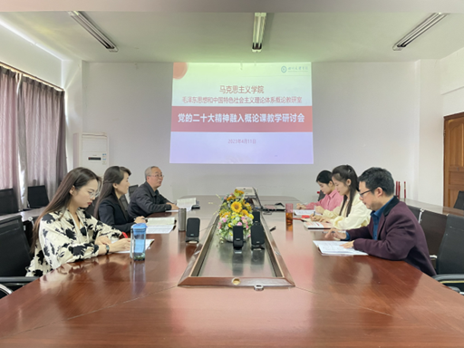 为全面贯彻党的二十大精神,推进习近平新时代中国特色社会主义思想“三进”的思想性、理论性和针对性,毛泽东思想和中国特色社会主义理论体系概论课教研室于4月11日在博文楼611会议室开展集体备课活动,主题:党的二十大精神融入概论课教学研讨会,教研室主任王维老师主持会议,教研室全体成员参会。