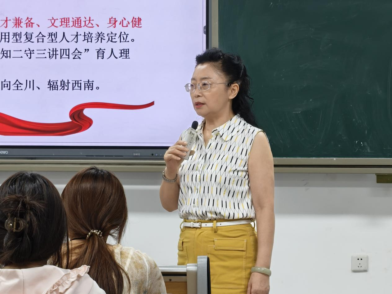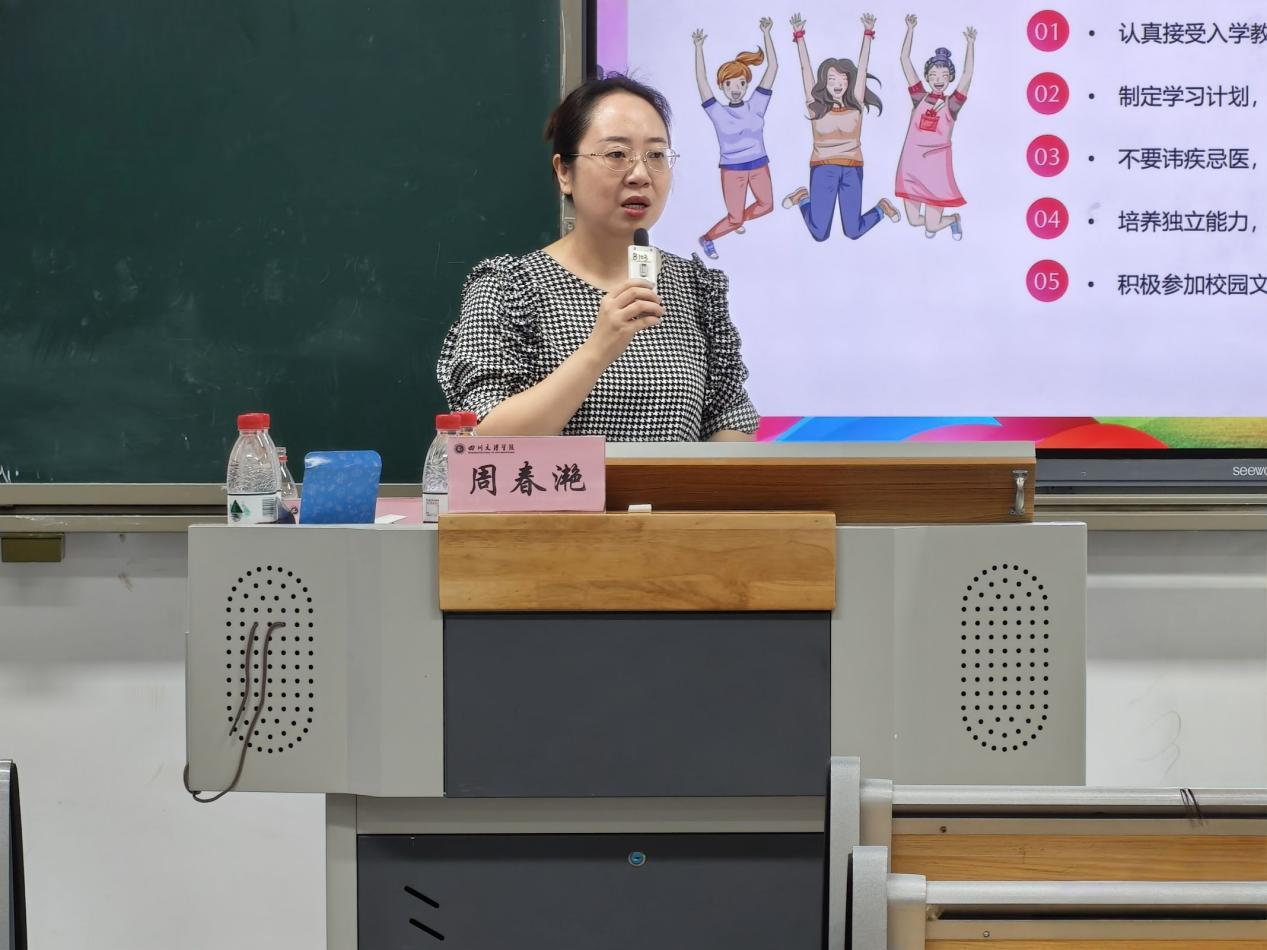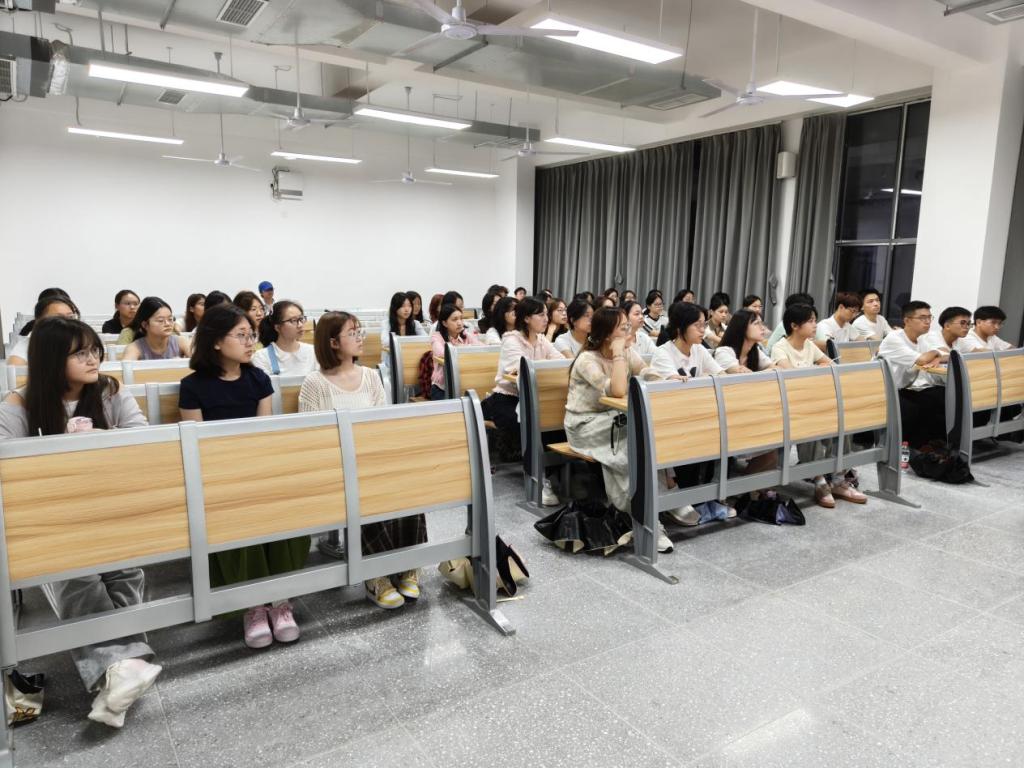 随后,周春滟就学业管理与老员工活适应发表讲话。她详细介绍了学分要求、学位授予条件及学业导师制度,提醒同学们合理规划选修课程,避免因学分不足影响毕业。此外,她还从心理调适、生活习惯、反诈防骗和职业规划等角度提出切实建议,引导大家尽快适应校园环境,养成健康作息,增强自我防范意识,并为未来职业生涯做好初步准备。
