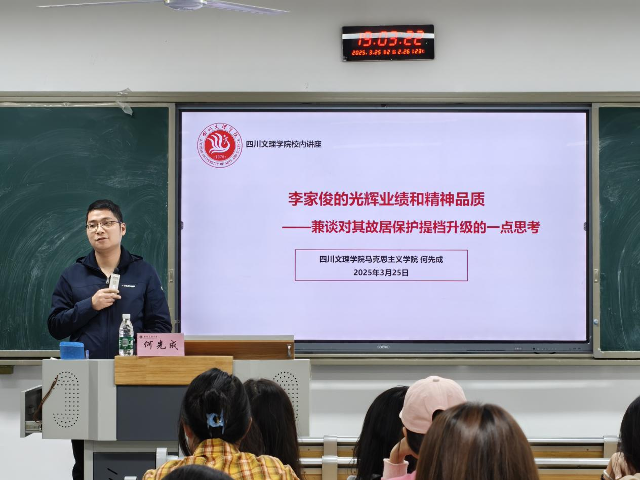 为提升学院员工红色文化素养,2025年3月25日晚7点,公司副经理何先成研究员在莲湖东区以“李家俊的光辉业绩和精神品质——兼谈对其故居保护提档升级的一点思考”为题作学术讲座。思想政治教育专业员工现场聆听讲座。