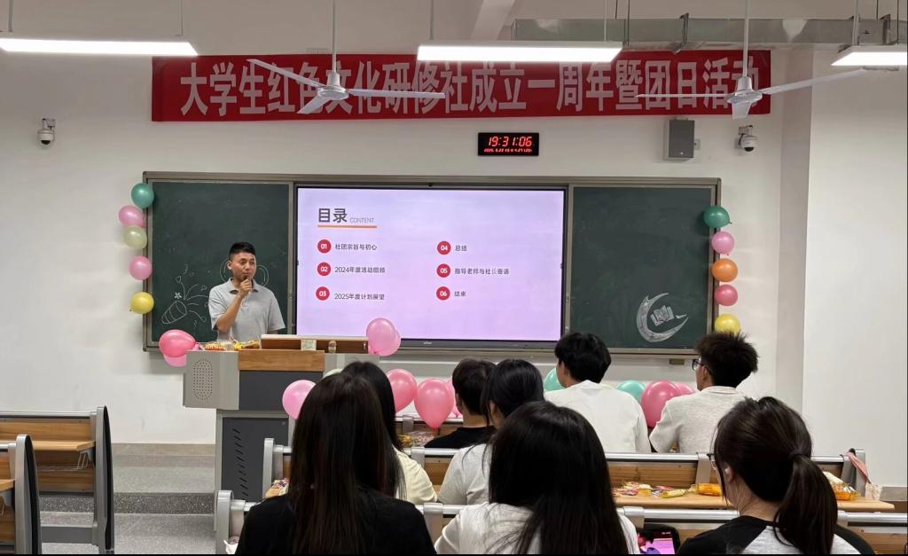 活动伊始,专题学习环节拉开帷幕。在浓厚的学习氛围中,同学们深入学习胜利80周年抗日战争史,进一步深化了理想信念。随后,鲁成老师走上讲台,饱含深情地为社团发展送上寄语,对老员工红色文化研修社一年来的努力与成绩给予充分肯定,并对未来发展提出殷切期望。紧接着,社长对社团一年来的工作成果进行了全面回顾,从红色文化征文活动到红色文化演讲比赛,每一个瞬间都凝聚着社团成员员的心血与热情。